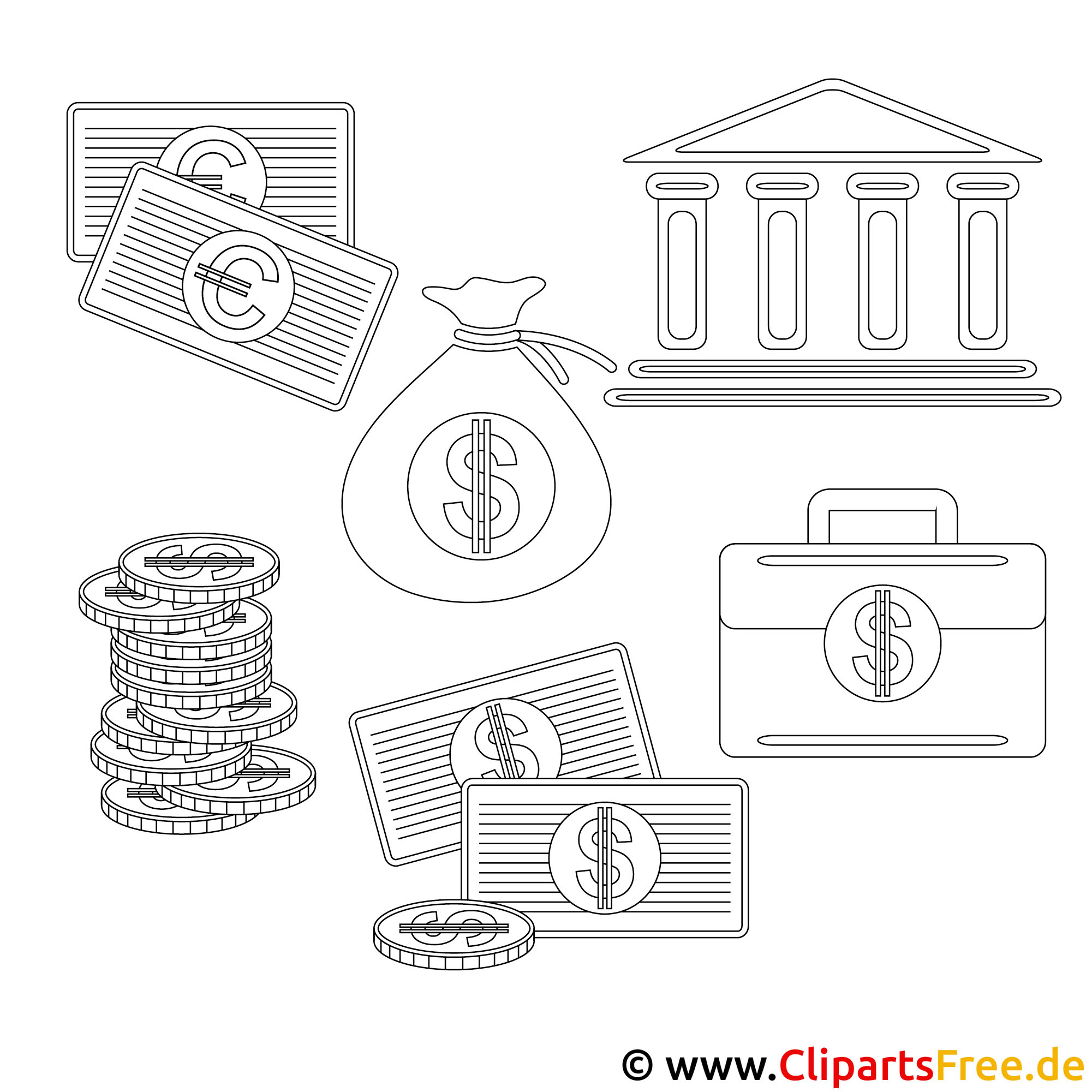 Das Ausmalbild zeigt eine bunte Ansammlung von verschiedenen Geldsymbolen. Da haben wir große Geldscheine, die in den unterschiedlichsten Größen und Positionen angeordnet sind. Ein großer Stoffbeutel mit einem Dollarzeichen strahlt förmlich die Idee von Reichtum aus. Außerdem sind Münzen und sogar eine Aktentasche zu sehen, die die durchwachsene Welt der Finanzen darstellen. Und ganz hinten, in der Mitte, tut sich sogar ein imposantes Bankgebäude hervor.... Es sieht aus, als wäre es für wichtige finanzielle Angelegenheiten zuständig. Eine wahrlich spannende und lehrreiche Szene zum Ausmalen!