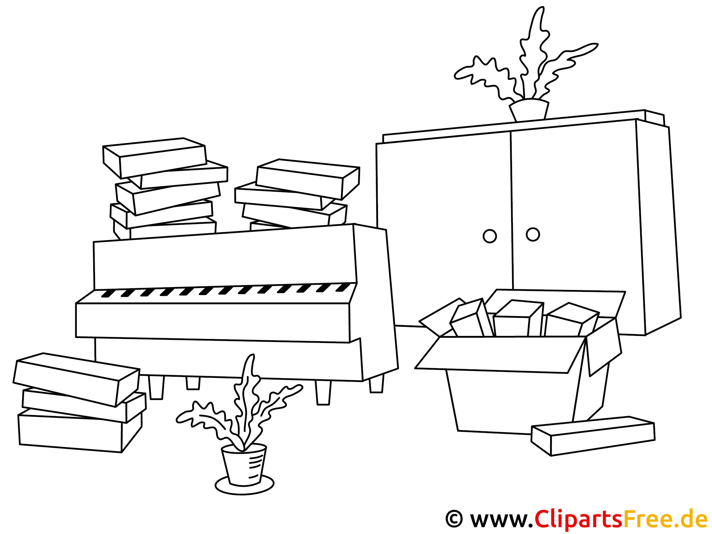 Das Bild zeigt eine bunte Szenerie – ganz oben ist eine Pflanze, die irgendwie lebendig wirkt. Daneben stehen viele Kisten, perfekt für ein bisschen Chaos, als würde jemand gerade umziehen oder aufräumen. In der Mitte sieht man ein Klavier, das wartet, um zum Leben erweckt zu werden. Schlicht, aber einladend! Rundherum sind allerlei Kisten und ein paar Details wie eine kleine Pflanze. Ehrlich gesagt, das schafft gleich eine ganz besondere Atmosphäre. Man sieht, dass hier etwas in Bewegung ist, und das lädt einfach zum Ausmalen ein!