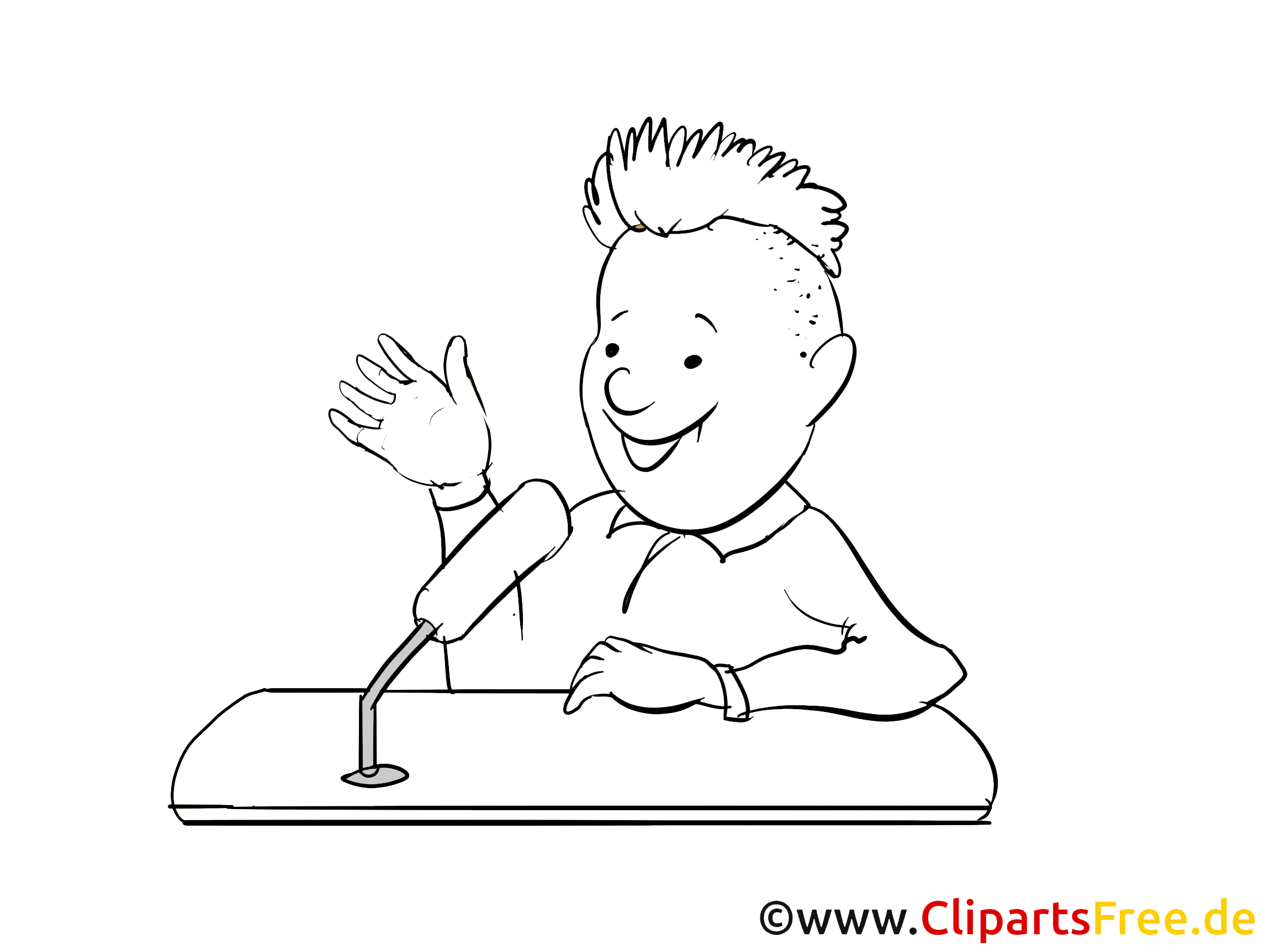 Das Ausmalbild zeigt einen fröhlichen Jungen, der an einem Rednerpult sitzt. Er hat einen coolen, unkonventionellen Haarschnitt und winkt begeistert in die Runde. Der Junge scheint eine spannende Geschichte zu erzählen oder ein wichtiges Thema anzusprechen. Mit seinem breiten Lächeln und der offenen Körperhaltung vermittelt er Freude und Selbstbewusstsein. Es ist fast so, als könnte man sein Lachen hören! Das Bild lädt zum Ausmalen ein und regt die Fantasie an – was mag wohl die Geschichte sein, die er erzählt?