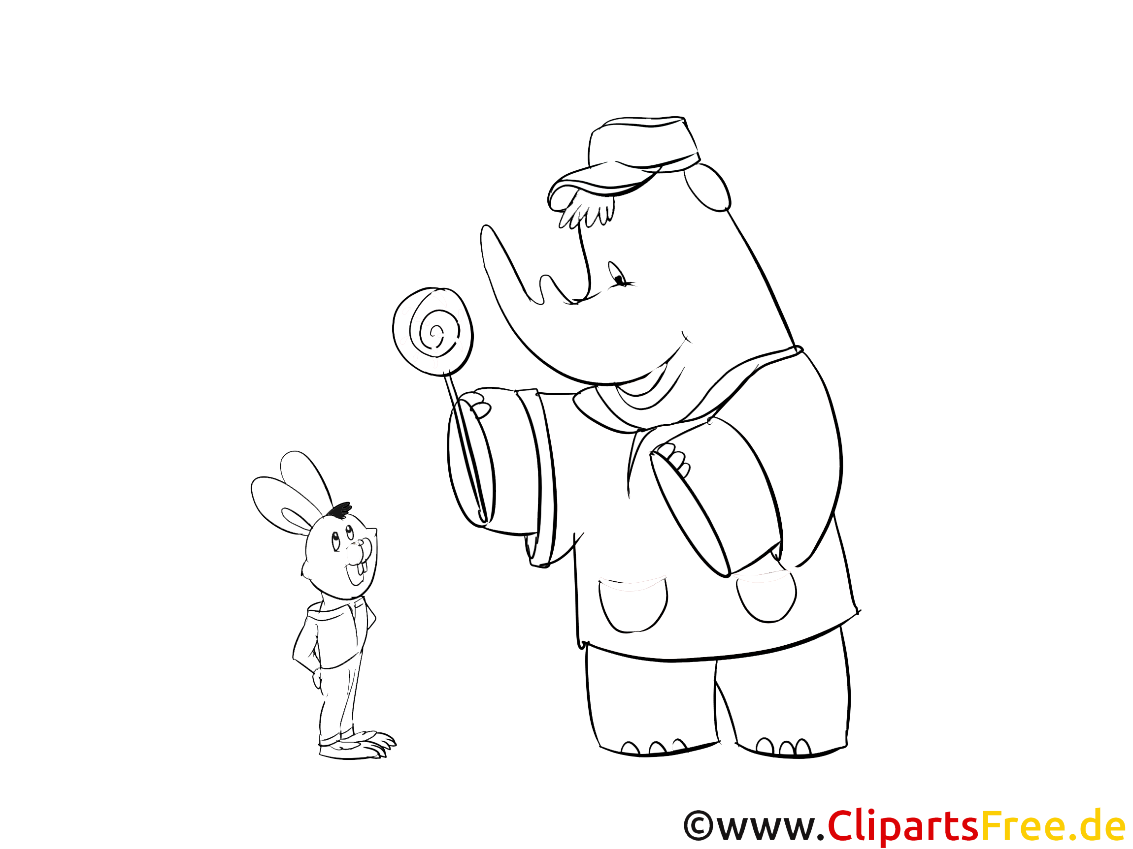 In diesem zauberhaften Ausmalbild stehen ein großer, freundlicher Elefant und ein kleiner, neugieriger Hase im Mittelpunkt. Der Elefant hält einen riesigen Lollipop in seiner pranken Hand, was wirklich ganz entzückend aussieht! Man kann sich vorstellen, wie der Hase mit seinen großen, aufrechten Ohren gespannt auf das süße Zuckerstückchen schaut. Das Bild zeigt kindliche Freude und Begebenheiten, die einem direkt ein Lächeln ins Gesicht zaubern können. Sie scheinen in einer zauberhaften Welt zu sein, wo Süßigkeiten und Freundschaft nur darauf warten, bunt ausgemalt zu werden.