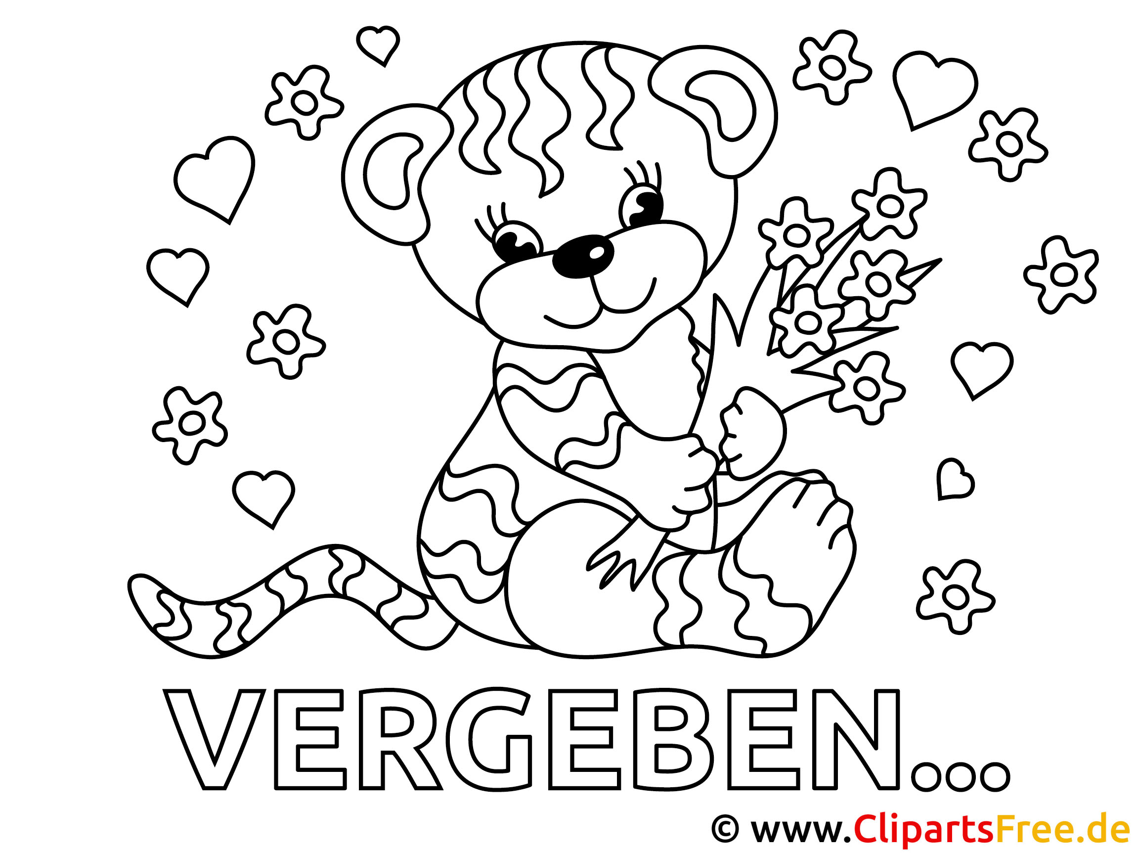 Das bereitgestellte Ausmalbild zeigt einen niedlichen kleinen Teddybären, der in einer sehr freundlichen und fröhlichen Pose sitzt. Er hat eine große, lächelnde Schnauze und glänzende Augen, die sofort ein Gefühl von Wärme verbreiten. In seinen kleinen Pfötchen hält er eine handvoll bunter Blumen, umgeben von Herzen und kleinen Blüten. Dieses Bild strahlt einfach Freude und Liebe aus, perfekt um verschiedene Emotionen wie Freundschaft oder Vergebung auszudrücken. Die große Schrift, auf der steht „VERGEBEN…“, macht das Bild besonders einladend, denke ich.